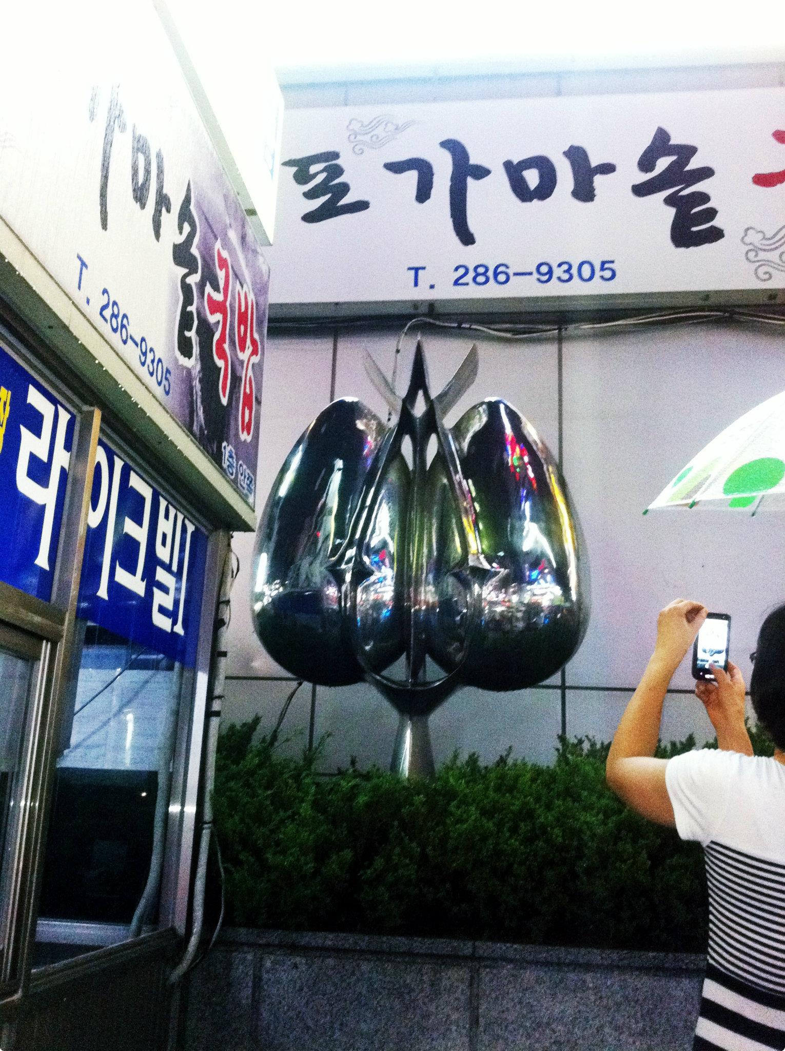 공공미술작품으로 설치된 문신의 조각작품이 무질서한 간판과 간이사무실에 가려 공공미술로서 가치를 상실했다.